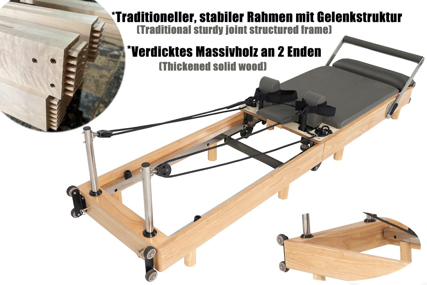- Machine Pilates Reformer robuste : elle possède un cadre solide et robuste qui peut supporter jusqu’à 400 lb de poids de l’utilisateur. Le cadre est fabriqué en bois de chêne de haute qualité grâce à une structure de joint traditionnelle robuste.