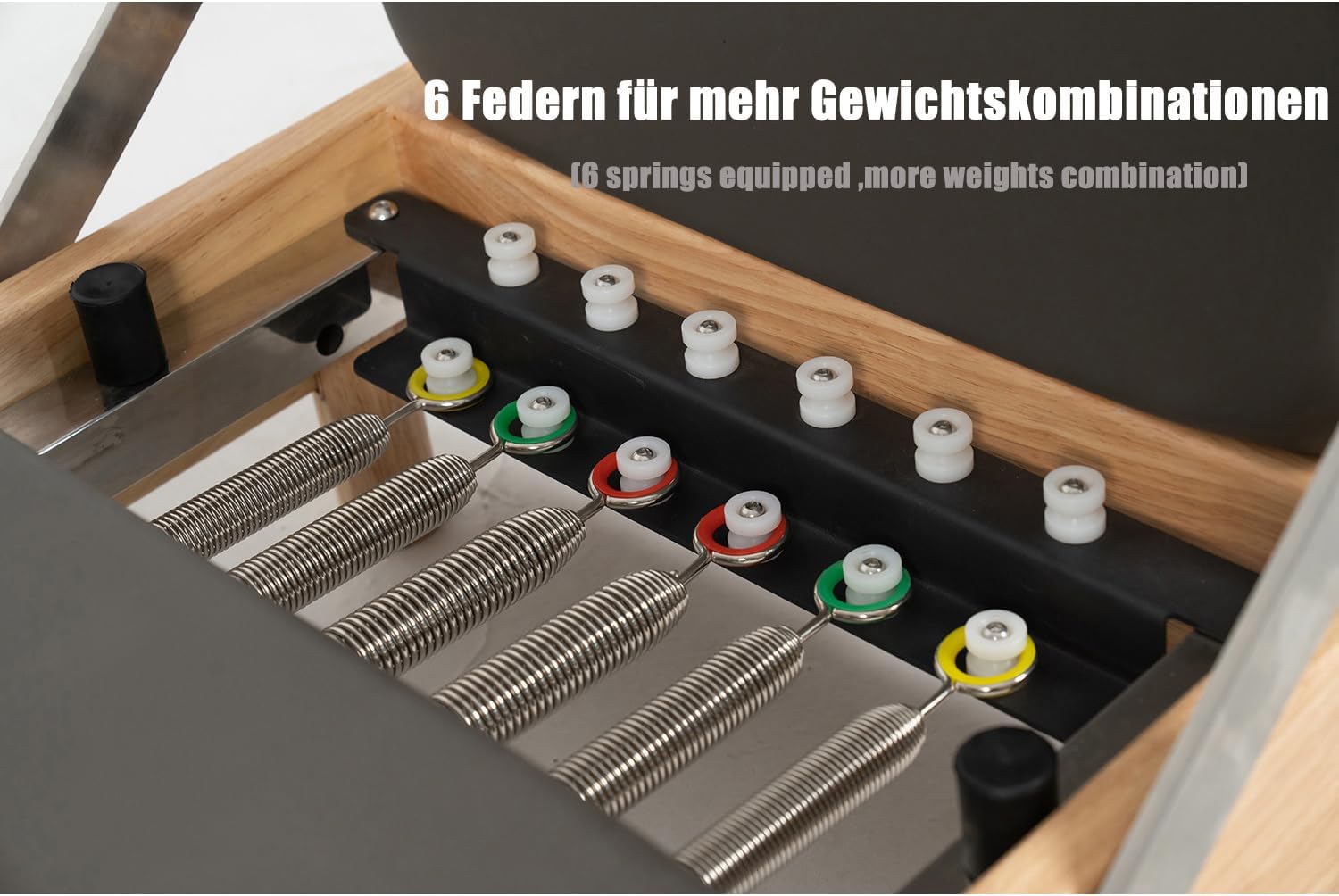 - Pilates Reformer équipé de 6 ressorts de résistance : cet appareil de Pilates Reformer est livré avec 6 ressorts de résistance qui vous permettent d’ajuster le niveau de tension et de défi pour vos exercices. Vous pouvez choisir parmi des ressorts légers, moyens ou lourds, ou les combiner pour un entraînement personnalisé. Que vous soyez débutant ou utilisateur avancé, vous trouverez la résistance parfaite pour vos besoins.